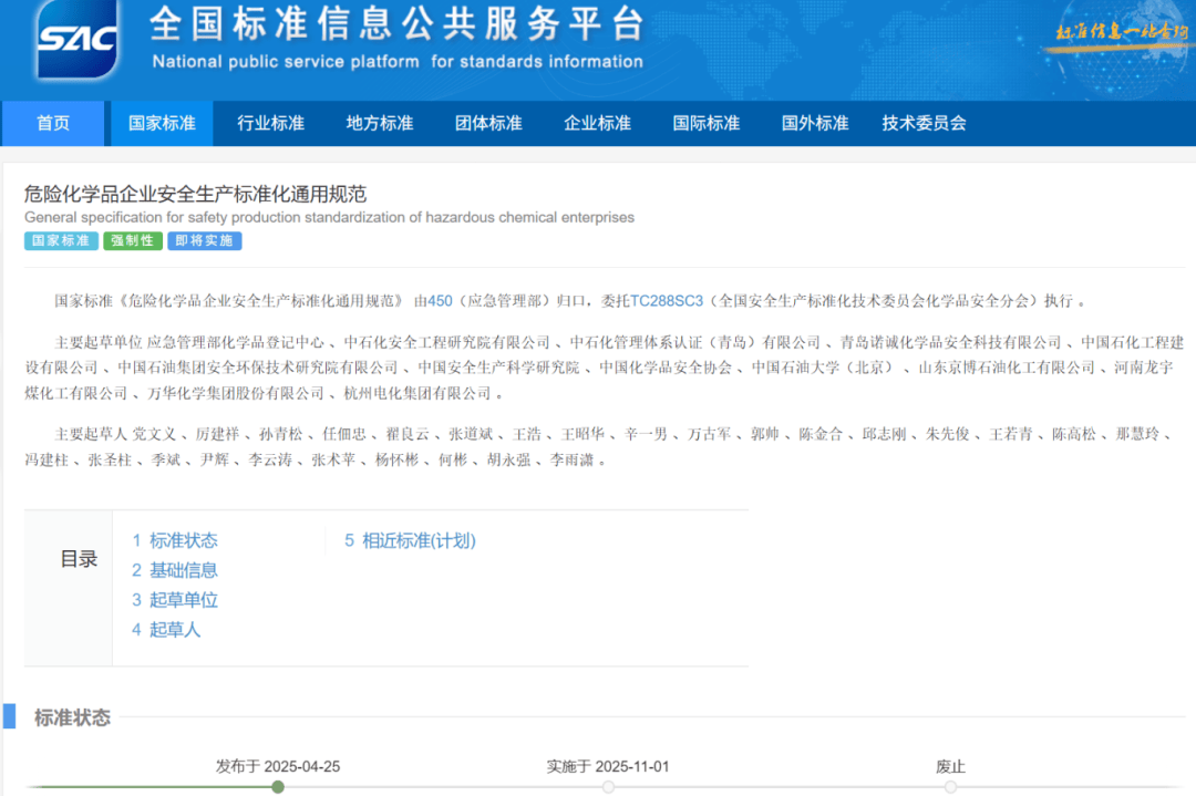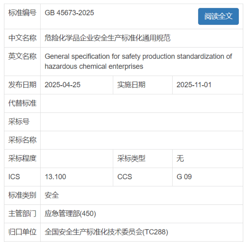 GB45673-2025 《化学品企业平安出产尺度化通用规范》于2025年4月25日结合发布,前往搜狐,取此前发布的《化学品平安出产风险分级管控手艺规范》(GB/T 45420-2025)构成互补,尺度实施后,合用于化工、新能源等高风险行业。通过同一平台实现风险监测预警取应急联动。合适《功课场合气体检测报警仪器通用手艺要求》(GB 12358-2024)等配套尺度;要求企业:
